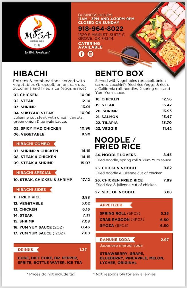 MOSA Hibachi & Sushi Grove stands out as a beloved dining option in Grove, Oklahoma, bringing authentic Japanese cuisine to the community. Situated conveniently at the southern end of Main Street, this restaurant blends a casual atmosphere with the culinary flair of Hibachi cooking. The spacious setup allows for wheelchair accessibility, ensuring everyone can enjoy the delightful food without hassle. From lunchtime crowds seeking quick bites to dinner gatherings filling the cozy space, the restaurant maintains a steady flow of visitors. The décor offers a trendy yet peaceful vibe, making it an ideal spot for both individual diners and families looking for a delightful meal together. On weekends and Fridays, expect to see a bustling crowd, as locals and tourists alike flock here for a taste of some of the best Hibachi in town. Easy street parking makes accessing MOSA a breeze, adding to its charm as a go-to dining hub in Grove.